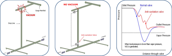 During crude oil loading, the pressure at the top of the drop line is often lower than ambient pressure because the vertical height generally exceeds 20 m and can reach 27 m for VLCCs. When this pressure drops below the True Vapor Pressure (TVP) of the crude oil, vaporization occurs and Volatile Organic Compounds (VOC) are generated.